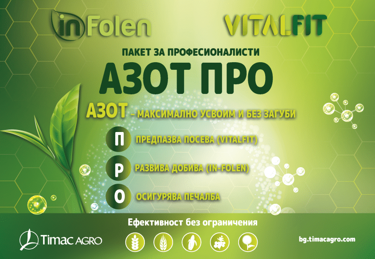 На база на многогодишните опити в България и в резултат на еволюцията, Тимак Агро разработи нова азотна технология за максимално ефективно използване на вложения азот АЗОТ ПРО: вкл. комбинация между INFOLEN* + VITALFIT*.